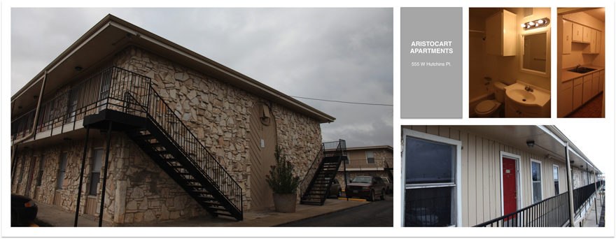 Each unit has all electric appliances such as refrigerators, stoves, ceiling fans. They also have tile (some ceramic), walk in closets, mini blinds. The complex has Parking Lot Security Surveillance and free Internet. Laundry facilities are on-site.Aristocrat Apartments is a 44 unit building built in 1970 and re-modeled in 2009. Located across the street from McCollum High School, Aristocrat offers ample parking, security and easy access to public transportation.
